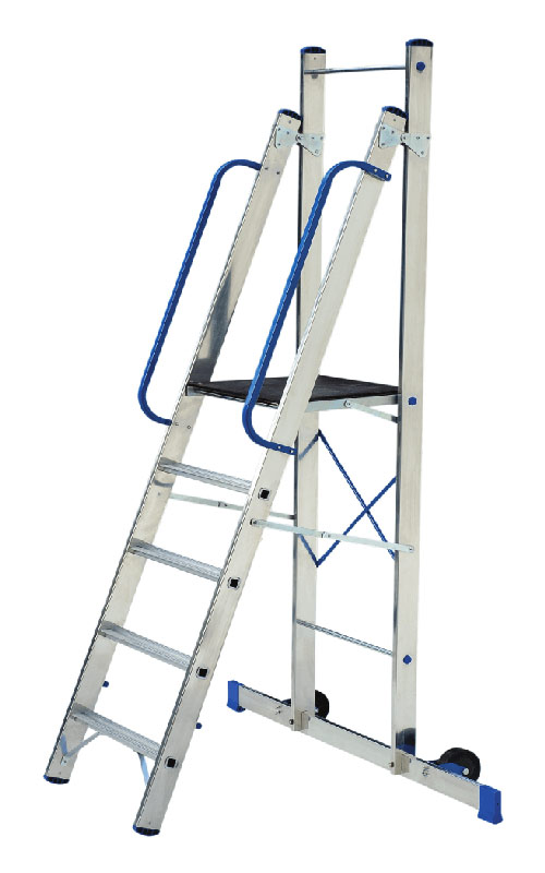 Hliníková plošina na kolieskach – ideálna pre obsluhu vyšších úrovní regálov. protišmykové stupne zábradlie pre bezpečnú obsluhu kolieska pre jednoduchšiu obsluhu nosnosť 150 kg