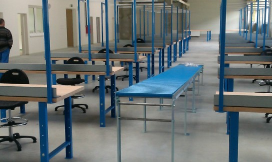 Kompletné zariadenie pracoviska, dielenské stoly, valcová dráha, pracovné stoličky.