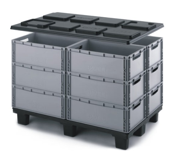 Hromadné balenie pre transport a skladovanie. Tak ako stohovacie prepravky je možné aj prepravky KLT jednoducho ukladať na plastové palety, zakryť spoločným vekom a tak bezpečne pripraviť na transport.