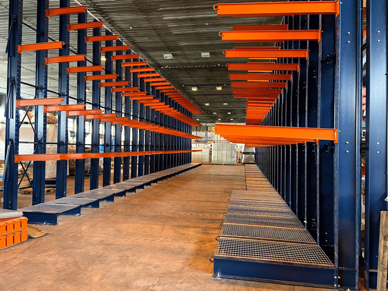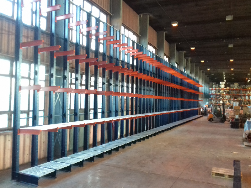 Zákazníkovi sme dodali a namontovali konzolový regál doplnený o oceľové rošty. Regál s výškou 6 m a dĺžkou 48 m, bol vyrobený tak aby reagoval na požiadavky zákazníka. Oceľové rošty osadené na prvých dvoch ukladacích úrovniach umožňujú ukladať atypické palety a balíky.