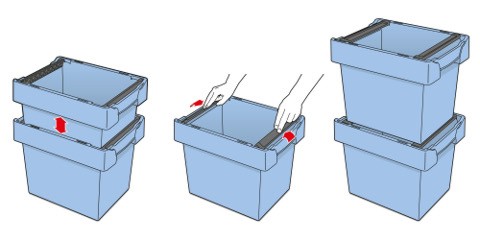 Kónické prepravky doplnené o stohovaciu lištu. Pomocou tejto lišty je možné prepravky ukladať na seba – tzv. stohovať.