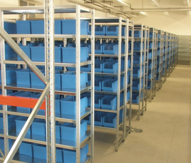 Bez skrutkové policové regále.  Realizácia skladu drobných dielov u zákazníka.  Policové regále boli doplnené o plastové skosené skladovacie nádoby.