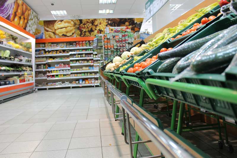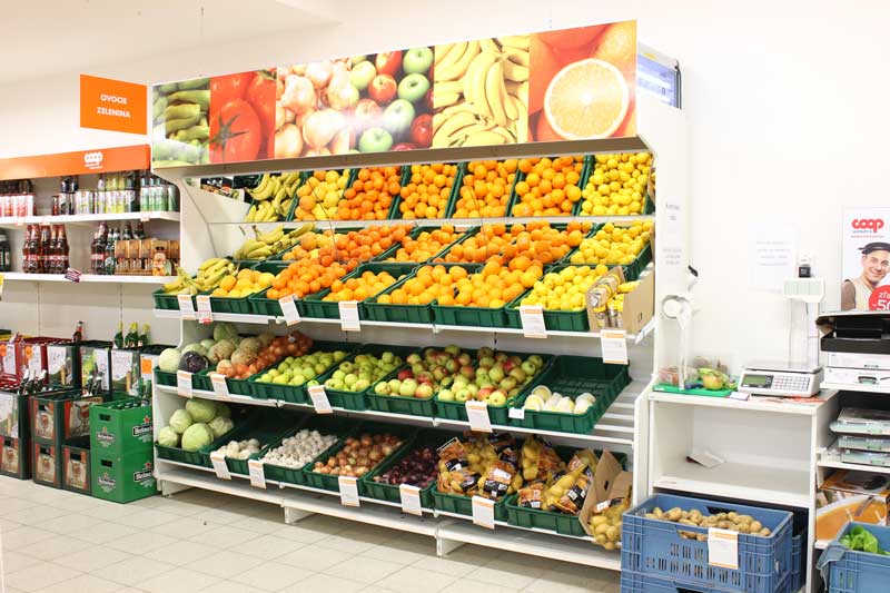 Konštrukcia regálu prispôsobená na uskladnenie zeleniny priamo do políc prípadne do prepraviek pre jednoduché doplnenie a výmenu tovaru.