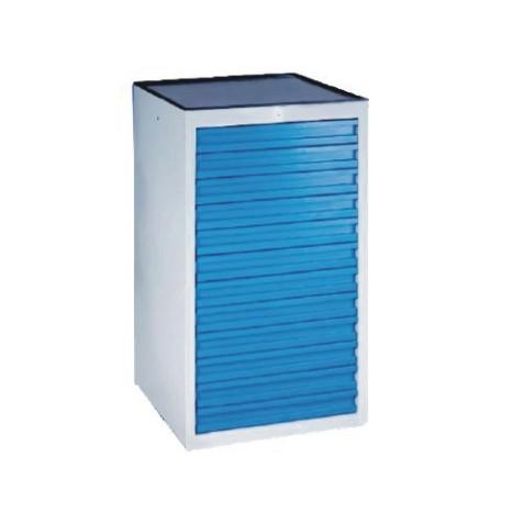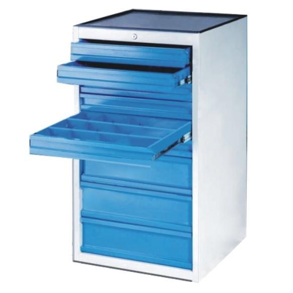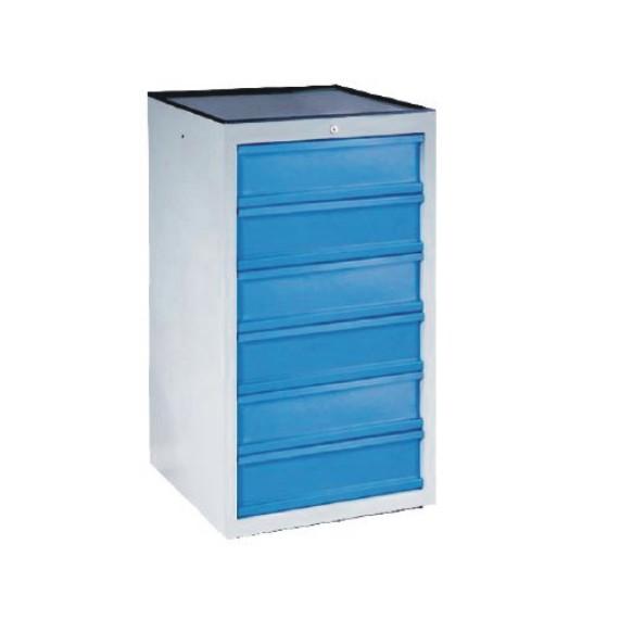 Kovová 6-zásuvková skrinka na náradie. Výška zásuviek je 145 mm, ich nosnosť je 40 kg. Skrinka je vybavená centrálnym uzamykaním, blokáciou a 100% -ným výsuvom zásuviek.